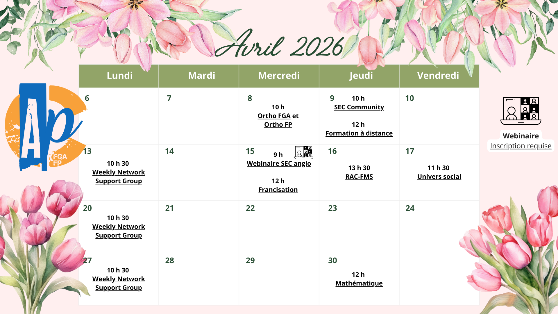Consultez les pages de chaque communauté sur le site des Après-cours FGA-FP pour découvrir les calendriers, les documents et certaines thématiques à venir.