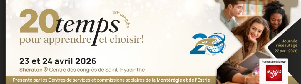 Le 20ᵉ congrès de l’Association québécoise des intervenantes et des intervenants en formation générale des adultes (AQIFGA) se tiendra les 23 et 24 avril 2026 au Centre des congrès de Saint-Hyacinthe. Visitez la page de l’évènement pour consulter la programmation et procéder à votre inscription!
