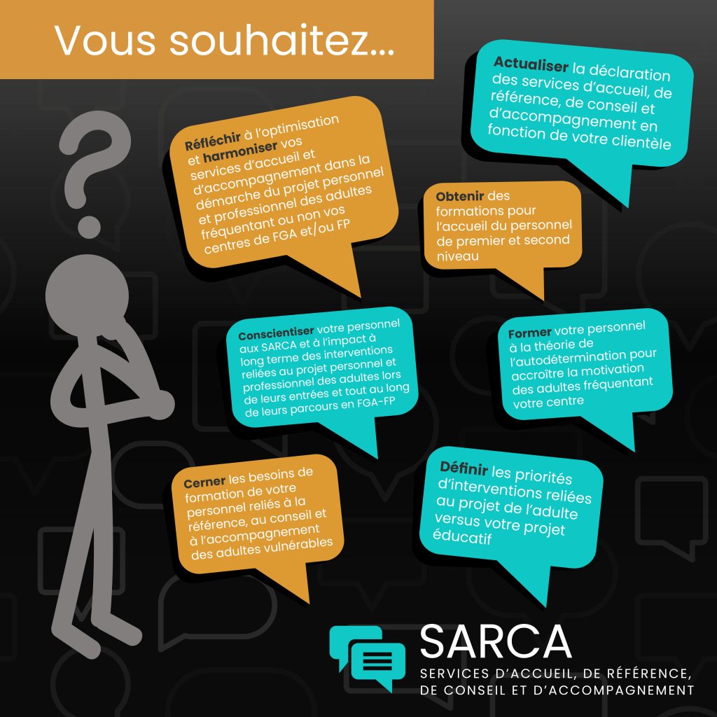 Nous sommes un service national d’accompagnement dédié au réseau de la formation générale des adultes (FGA) et de la formation professionnelle (FP). Notre mission est de structurer et d’organiser les services SARCA (Services d’accueil, de référence, de conseil et d’accompagnement) pour mieux répondre aux besoins des adultes dans leur parcours éducatif.