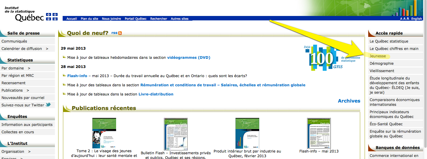 En vous rendant sur le site (www.stat.gouv.qc.ca) et en choisissant « JEUNESSE » dans la colonne de droite, vous aurez accès à plusieurs statistiques compilées par l’ISQ.